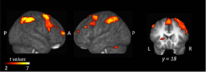 Le but de la présente étude était de comparer les bases cérébrales de l’apprentissage social avec celles de l’apprentissage par essai et erreur. Nous avons choisi la résonance magnétique fonctionnelle (IRMf), une technique d’imagerie qui permet d’obtenir une cartographie très précise des activations cérébrales liées à la réalisation d’une tâche. Les résultats que nous avons obtenus, qui ont été publiés dans la revue PlosOne en 2013, suggèrent que le traitement de l’information pendant l’apprentissage social et l’apprentissage individuel engage des réseaux cérébrales communs (Figure 2). Ces réseaux incluent le système fronto-parietal, la boucle associative fronto-striatale, ainsi que le système de neurones miroir.