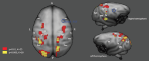 Figure 2. Résultats de l’étude IRMf, publiés dans le journal PlosOne courant 2013, qui permettent de localiser les activations BOLD liées à l’apprentissage social chez l’homme.